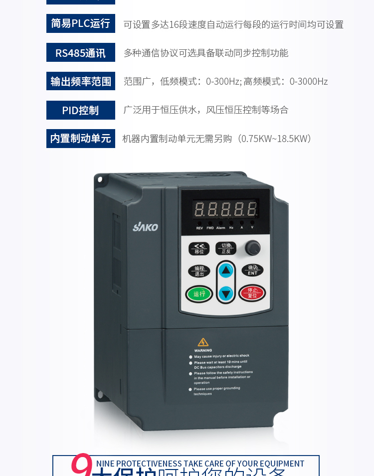 ⊙提供多種故障保護功能:過流、過壓、欠壓、過溫、缺相、過載等保護功能