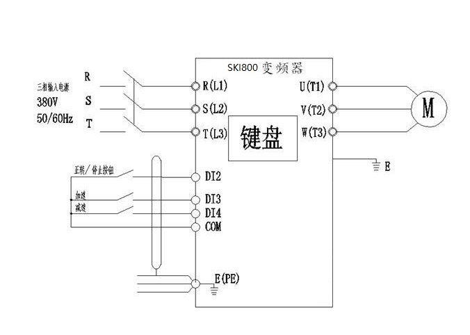 根據(jù)牽引電機工作原理,利用紅外線開關控制牽引電機速度,紅外開關通牽引減速,反之加速;根據(jù)工況,采用普傳科技SKI800變頻器控制牽引電機,變頻器采用端子臺控制、頻率源主設為鍵盤電位器給定,頻率源敷設為鍵盤設定頻率UP/DOWN可修改,掉電不記憶;頻率源疊加選擇為個位:主輔運算結果,十位:主+輔;紅外開關常閉接DI3和COM,常開接DI4和COM;原理圖如下: