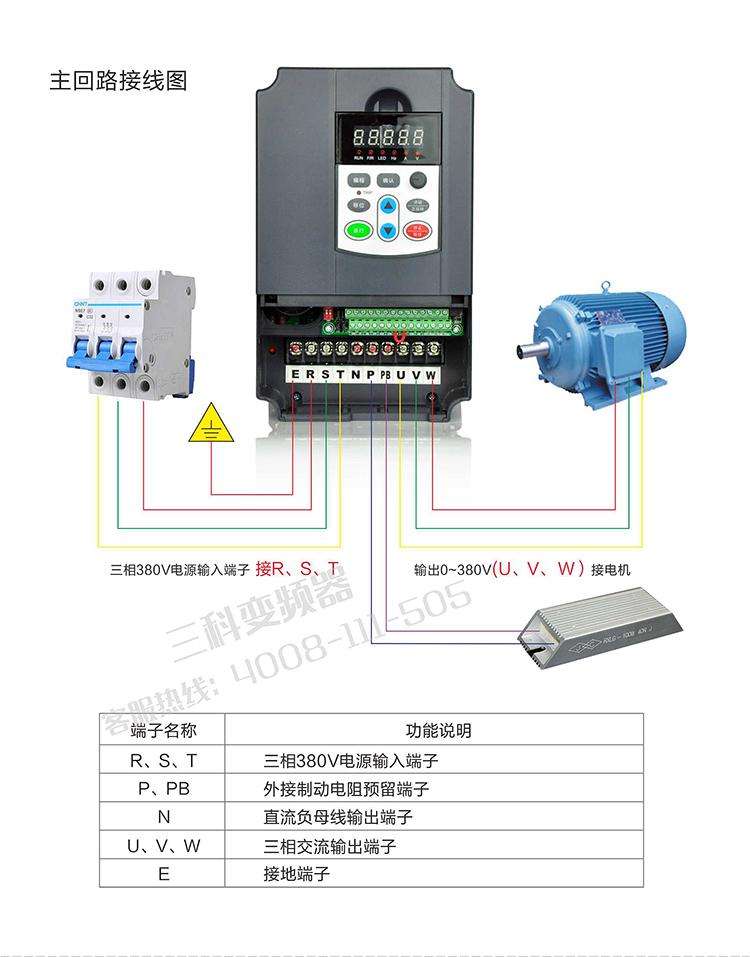 3、 變頻器輸出側(cè)不允許接(電容器),也不允許接電容式單相電動機(jī)。