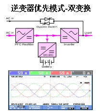 逆變器優(yōu)先運(yùn)行模式(雙變換)。如下圖示,從電氣變換技術(shù)角度來(lái)看,工頻機(jī)高頻機(jī)都是采用的雙變換在線式技術(shù),即能量經(jīng)過(guò)整流器逆變器兩次能量變換后,由逆變器提供電壓精度為1%、諧波含量小于5%的正弦波交流電給負(fù)載供電。這種運(yùn)行模式也可以稱為:逆變器優(yōu)先運(yùn)行模式(雙變換)。