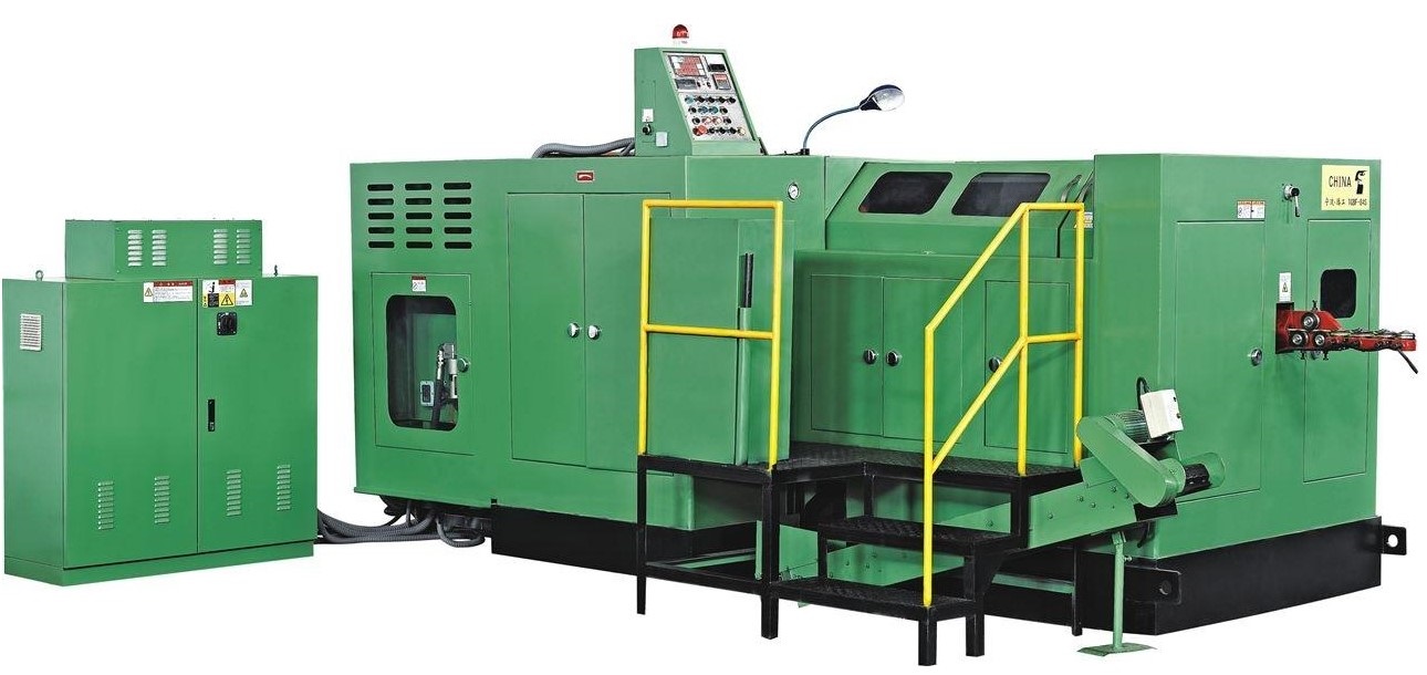 采用冷拉銅,鋁絲,鐵絲等自動冷鐓,是生產(chǎn)抽心鋁鉚釘,半空心鐵鉚釘?shù)膶S迷O(shè)備。該機的全部結(jié)構(gòu)從校直,選料,切割二次成形至落料全部自動進(jìn)行,具有成形標(biāo)準(zhǔn)穩(wěn)定,加工品種多等優(yōu)點。